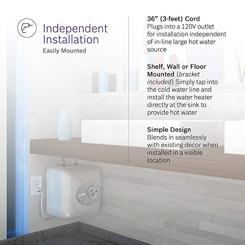 - EASILY MOUNTED: Can be shelf, wall or floor mounted (bracket included); simply tap into the cold water line and install the water heater directly at the sink to provide hot water