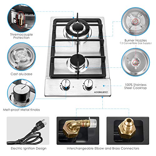 Details: AUODGDNT Chef focuses on kitchen products and continues to explore for innovations for years in order to achieve the vision and mission of to be a first-class enterprise .We don’t choose products based on market interests or fancy analytics. We develop tools and products for ourselves and our customers based on real-world needs and expectations. AUODGDNT 12 inch Stainless Steel Gas CooktopProduct Technology SpecificationProduct Dimension: 12.2'' x 20'' x 4.7''Built-in Dimension: 10.8'' x 18.7''Fuel Type: Propane / NGIgnition Type: Electronic IgnitionVoltage: 110V~ / 60HzKindly Note: A gas leakage test must be passed with soapy solution before use.EASY TO CLEANThe laser cut full-width edge-to-edge heavy cast iron grates can be cleaned in the dishwasher for hassle-free, effortless cleaning and maintenance to enhance the look.SAFETY PERFORMANCEThe use of a thermocouple flameout fault system ensures that the gas is automatically turned off when no flame is detected, helping to avoid gas leakage.GREAT COOKING EXPERIENCEThis 12-inch gas cooktop features 2 high efficiency sealed burners. The 2 burners include a 5,000BTU semi-rapid burners and a 8,500BTU rapid burner. These multiple powerful burners can meet your different cooking requirements.100% CUSTOMER SATISFACTION GUARANTEEDAUODGDNT gas stove top made in 100% stainless steel for long lasting usage and no need to pay for another gas cooktop. If you encounter any product after-sales problems, you can contact AUODGDNT support team at any time,Professional team is always on line.PACKING LIST1x Gas Cooktop1x Wrench1x Elbow Connector 1x Brass Connector 4x Nozzles2x oil free cover1x User Manual