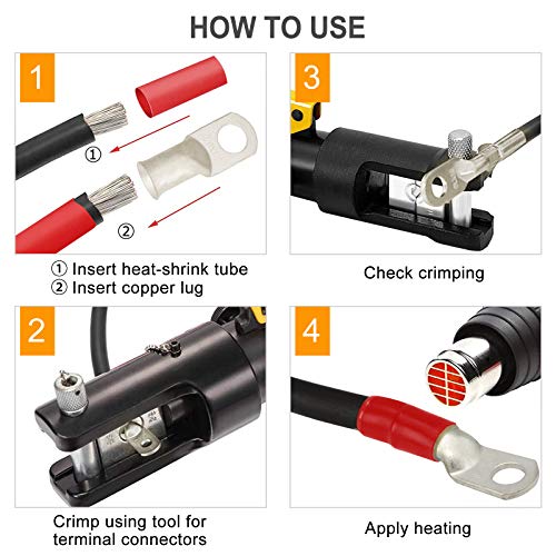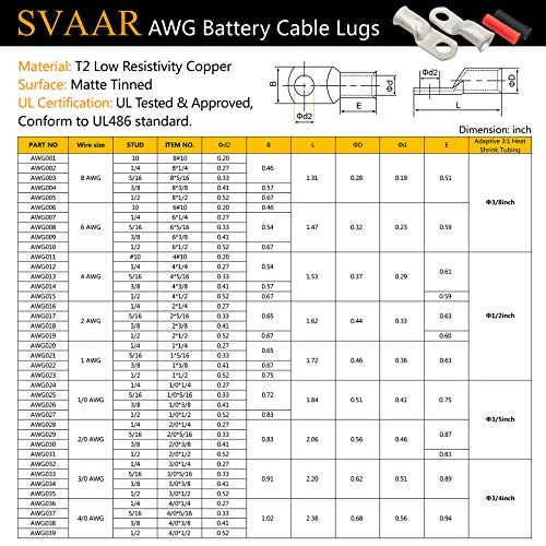 Details: UL Certification:UL Tested & Approved,Conform to UL486 standard.Specifications:Product Name: Tinned Copper LugsMaterial: Low (electrical) Resistivity T2 Purple Copper with special Matte Tinned processSurface: Matte TinnedColour: SilverSize type: 2/0 AWG-3/8"Ring with 3:1 Heat Shrink Tubings❤Wire gauge identification marked on lug barrels. Heavy duty Electrical Lugs are great for inverters, Battery and automotive applications.❤These lugs can be connected to a cable such as a battery cable by simply stripping insulation from the end of your cable, placing the lug over the exposed cable and crimping the barrel tightly and securely to the end of the cable.❤Flared opening for easy wire insertion.They can also be soldered on.❤T2 low resistivity copper which offers excellent conductivity for any application you my have.With special matte tinned process, their less Impurities and provide you a higher degree of conductivity and more corrosion .❤Tinned Copper lugs feature With a smooth surface for an aesthetically pleasing finish and seamless performance.❤Come with 3:1 dual wall adhesive heat shrink tubings(5 Black+ 5 Red),good insulation and sealing effect to keep the cable dry and extend the service life.And also used to distinguish positive and negative electrodes.Package Included:2/0 AWG-3/8"Ring----10pcs;3:1 dual wall adhesive Heat Shrink Tubings----10Pcs(5 Black+ 5 Red).Total 20pcs in one Package.Notice:⚠! Warning: The product doesn't suitable for children, please keep them away from kids.⚠! When crimping, make sure to select the copper wire that matches the wire gauge.♥If you have any questions, please feel free to contact us, We will res
